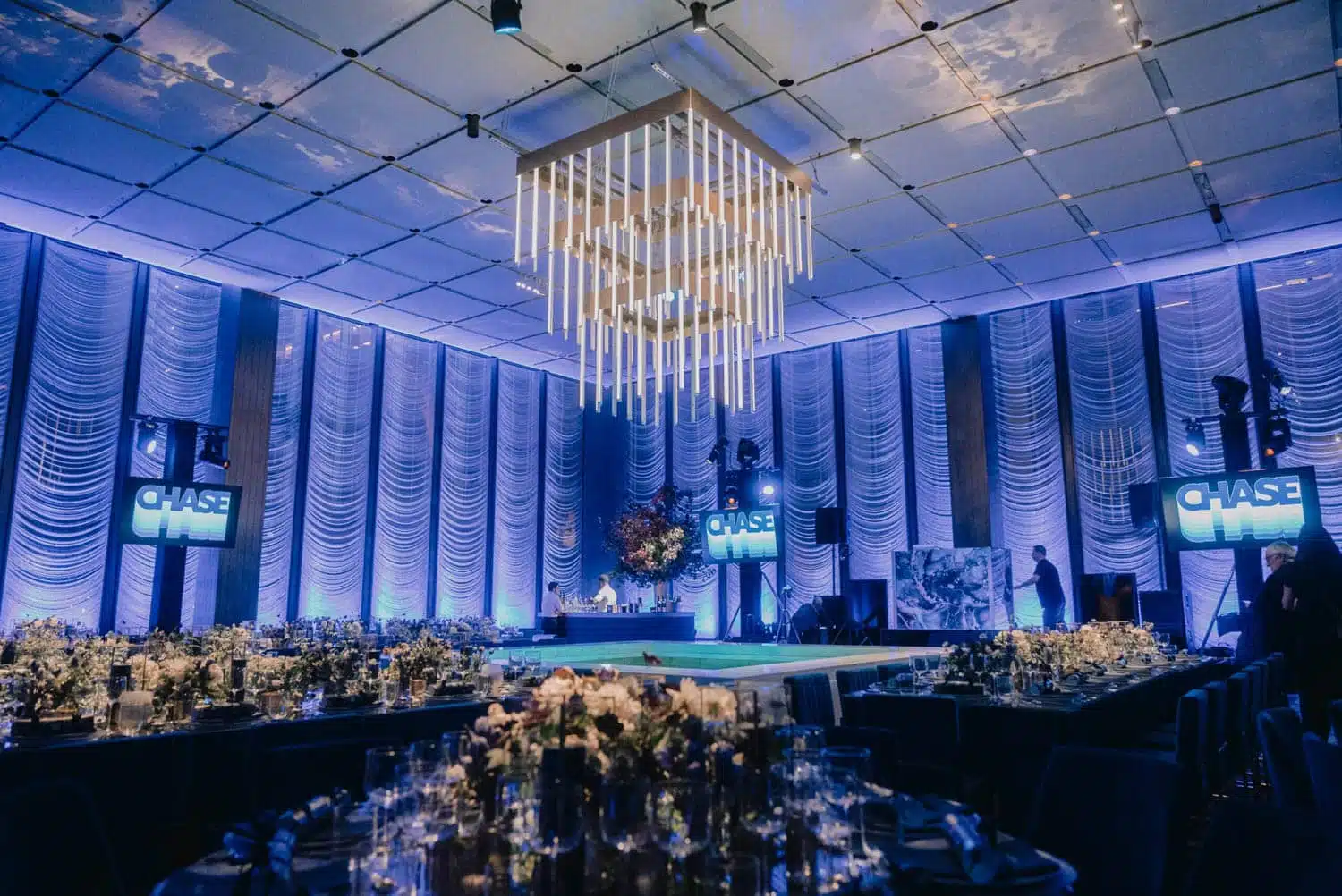Our team handled the full process — concept development, engineering, fabrication, lighting design, and on-site installation — to deliver a sculptural LED fixture that washed the room in warm, dynamic light. The result was an unforgettable moment of elegance and artistry that transformed the space from extraordinary to truly unforgettable.