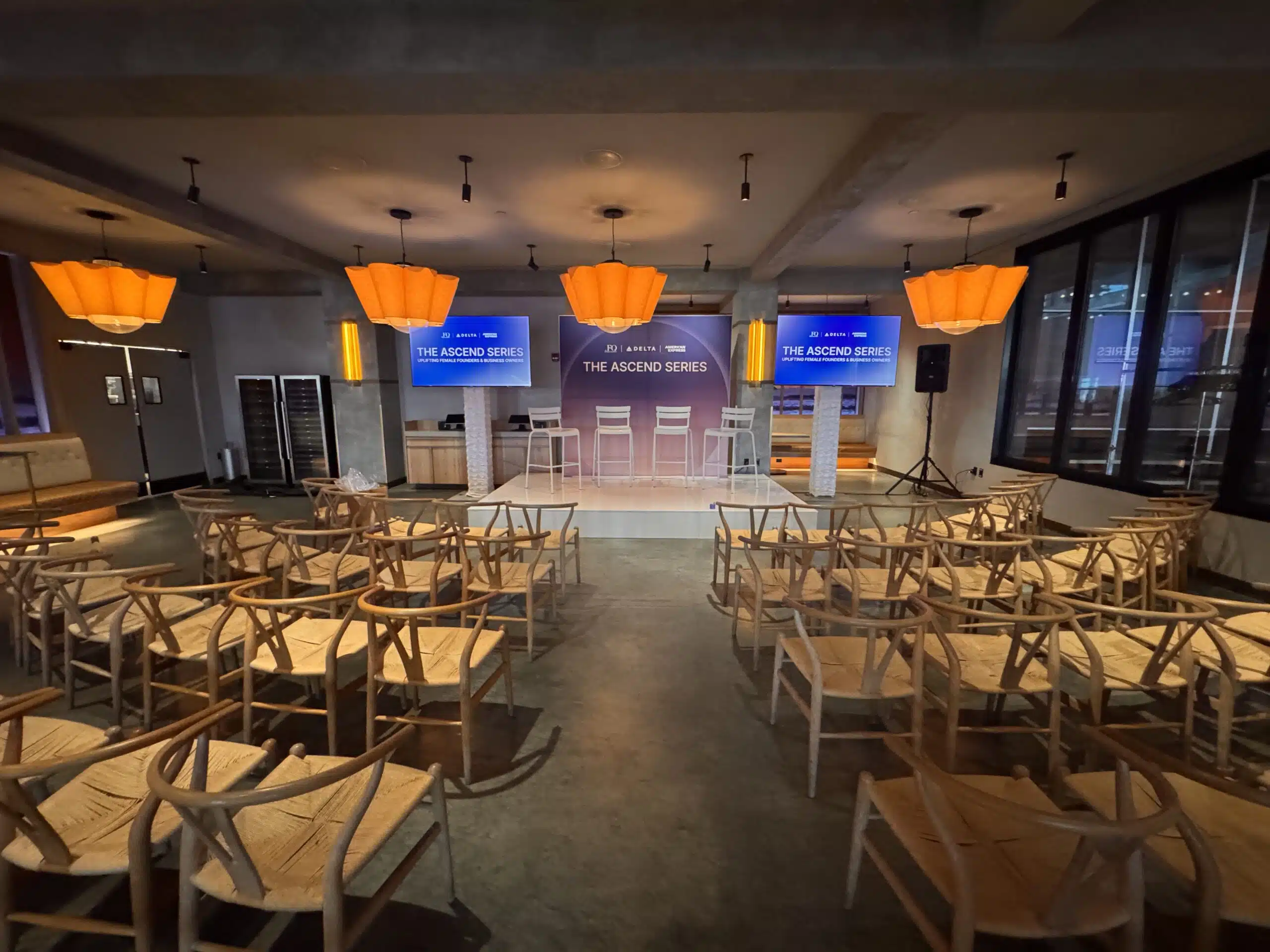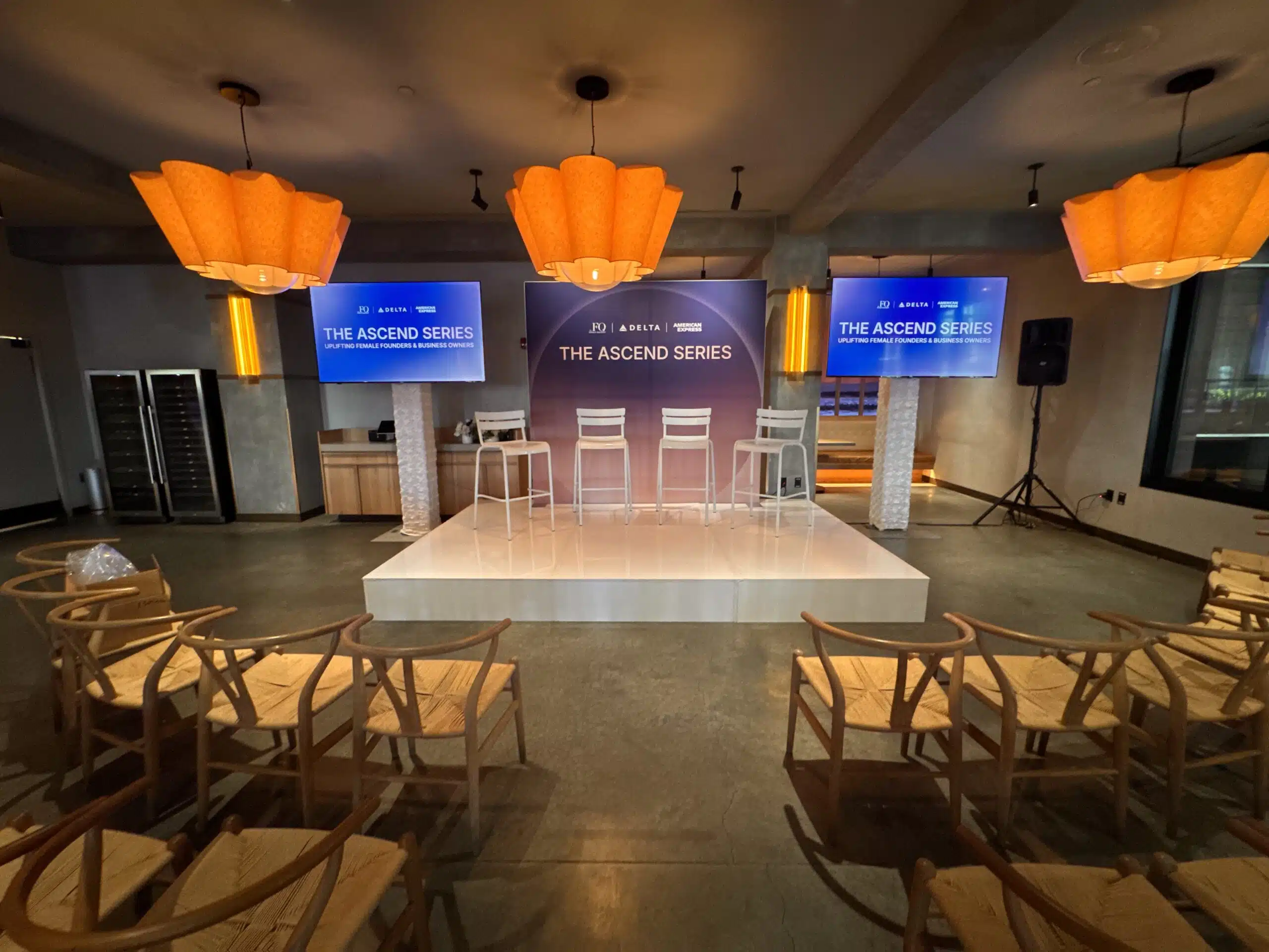 Our team produced and installed all branded elements throughout the venue — including SEG frames, window graphics, signage, and a custom swag bar — creating a fully immersive brand experience for attendees, sponsors, and speakers. With partners including Delta and American Express, and a featured appearance by Venus Williams, the Ascend Series demanded precision execution and premium presentation at every touchpoint.